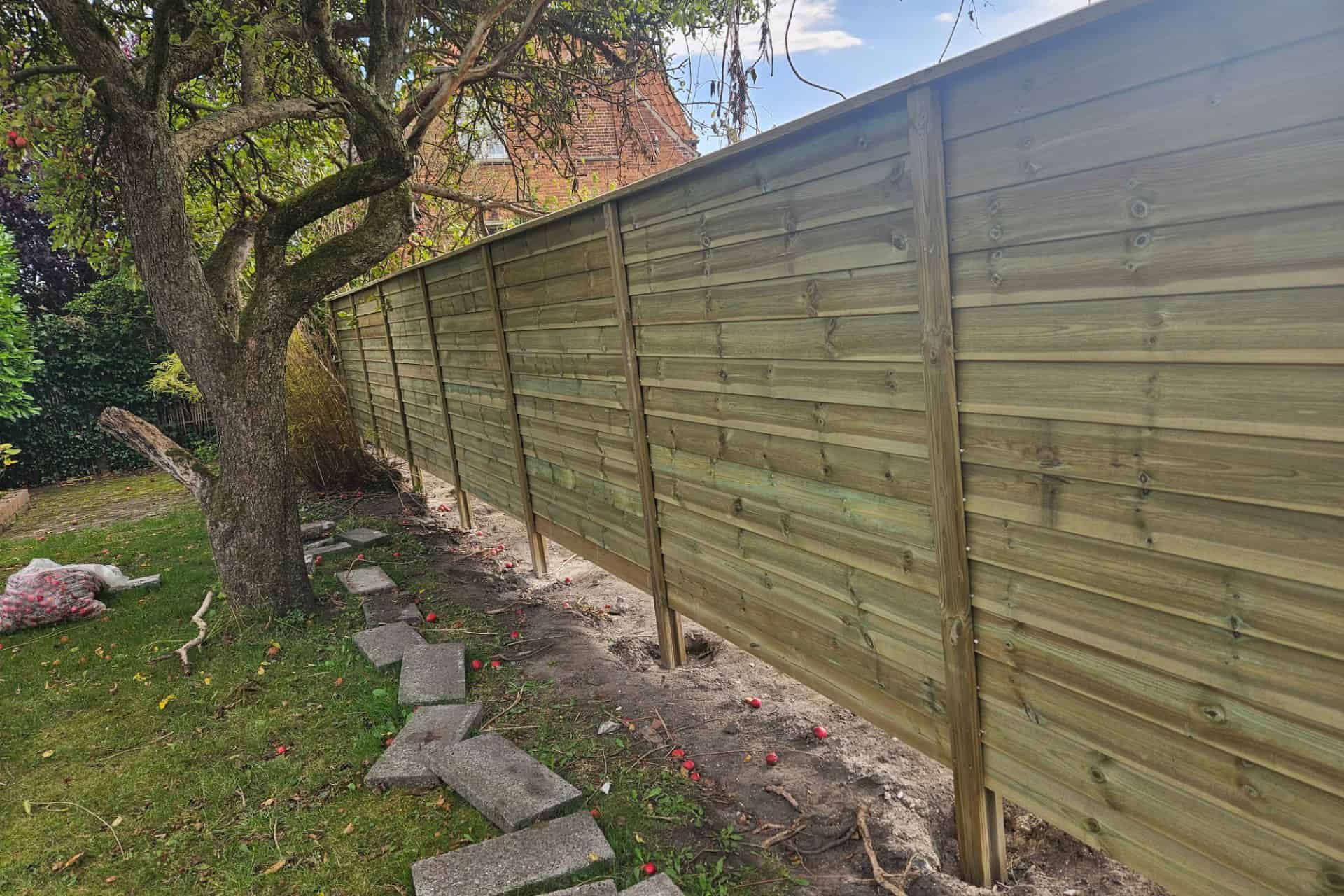 Når vi sætter hegn op, har vi altid fokus på, at konstruktionen skal kunne modstå vind og vejr. Et hegn fungerer som en stor flade, som vinden presser mod, og derfor sørger vi altid for en stabil fundering af stolperne.